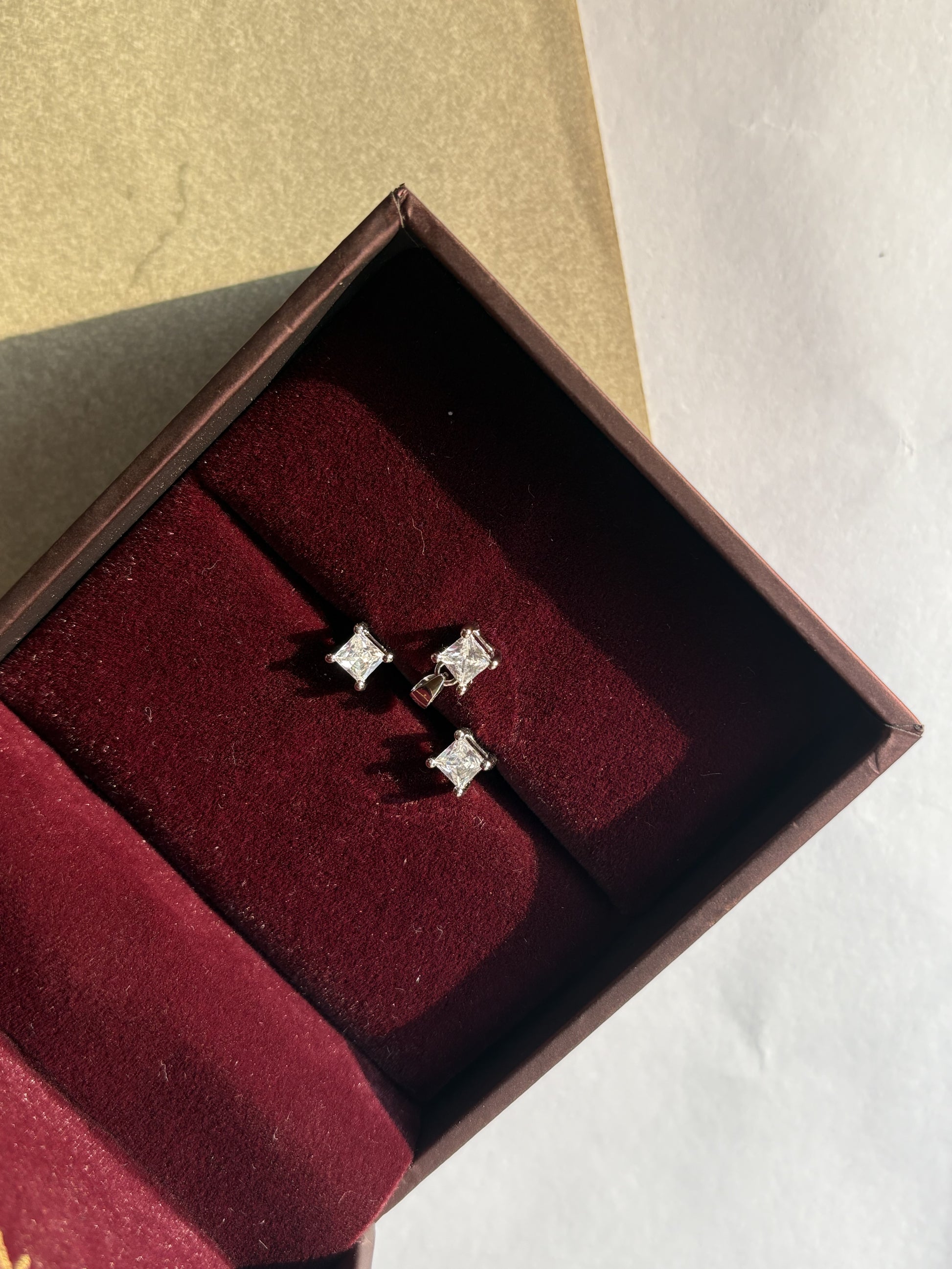 Complete your look with these Single Stone pendant sets. This exquisite set includes a stunning pendant and matching earrings, adding an instant touch of sophistication and luxury to any outfit. With their elegant square shape and sparkling design, these studs are a must-have for any fashion-forward individual.